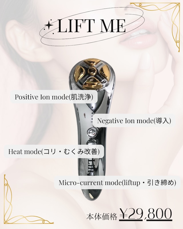 4つのモード搭載・多機能スキンケア美顔機 【lift me】 肌悩みに合わせて使い分けられる 4つの基本モードを搭載したホームケア美顔機です。 毎日のケアに取り入れることで、透明感のある引き締まった素肌へ導きます。 【機能モード】 ■ プラスイオンモード(肌洗浄) イオンの力で 皮脂・ホコリ・古い角質 を吸着。 毛穴の奥の汚れまで除去し、肌のキメを整え、 くすみの原因となる乾燥小ジワも予防します。 後のスキンケアが浸透しやすい肌の土台をつくります。 ■ マイナスイオンモード(美容成分導入) マイナスイオンの力で、 ビタミンC・アミノ酸などの水溶性成分を肌の奥へしっかり浸透。 潤い・ハリ・透明感を高め、エイジングサインにアプローチします。 ■ マイクロカレントモード 生体電流に近い微弱電流で肌にアプローチ。 ・血行促進 ・ハリ・弾力アップ(コラーゲン・エラスチン生成をサポート) ・フェイスラインの引き上げ、たるみ改善 ・小ジワケア ・筋肉疲労の回復 スッキリと引き締まった印象へ。 ■ 温熱モード 心地よい温度で肌を温め、 ・血行促進 ・代謝UP(ターンオーバーのサポート) ・表情筋をほぐしてむくみ改善 ・毛穴を開かせて汚れを浮かせる ・リラクゼーション効果 美容成分が浸透しやすい柔らかな肌に整えます。 【操作方法】 1. 電源ボタンを長押しして電源をオン。 2. モード切替ボタンで 4つのモードを選択できます。 3. 電源オン後、ギア切替ボタンで 出力レベル調整が可能。 4. 電源をオフにする時は 電源長押しで停止します。 ※保証は購入日より1年間となります。